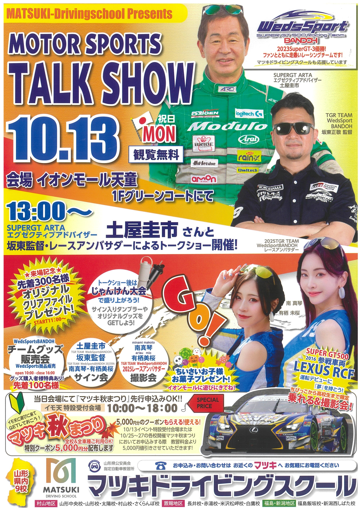 10/13 イオンモール天童にてMOTOR SPORTS TALKSHOW開催!土屋圭市さんと坂東監督